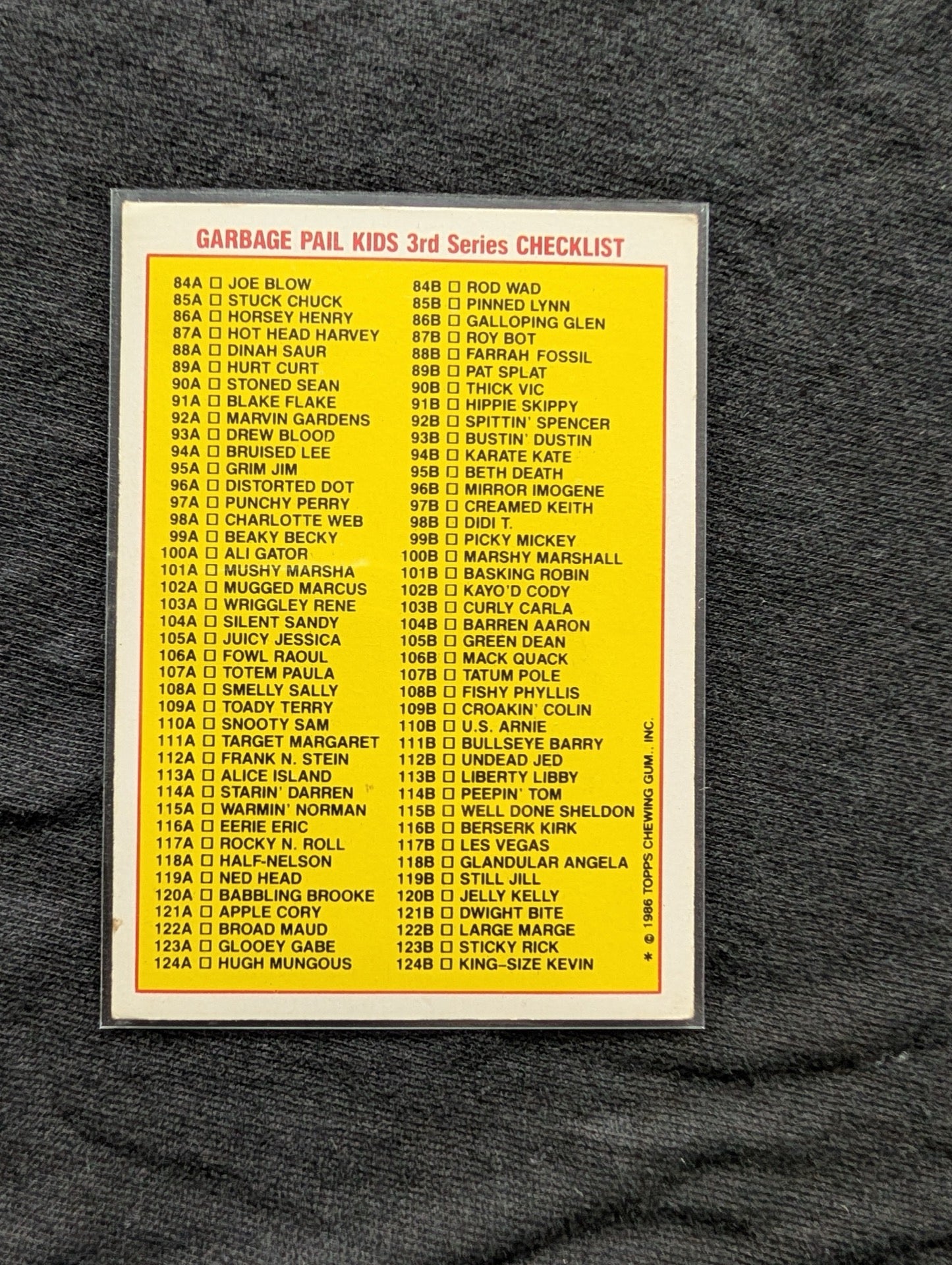 Up for auction is a vintage matching pair of Garbage Pail Kids sticker cards from the iconic Original Series 3 released in 1986. This lot includes both the 'a' and 'b' name variations for card number 86: