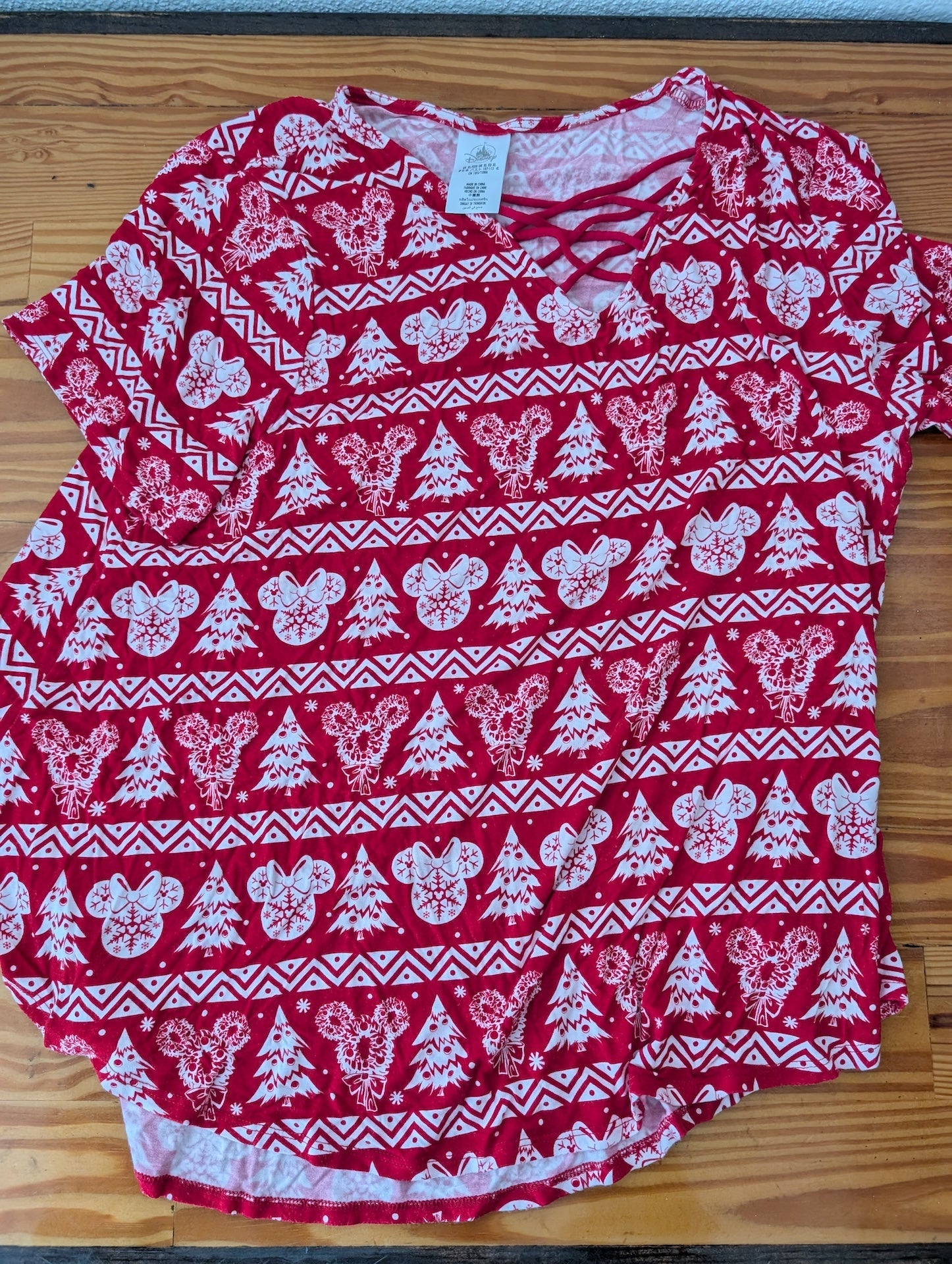 A short-sleeve, red and white v-neck shirt with a criss-cross detail at the neckline. The pattern features repeating rows of white Christmas trees and Mickey Mouse head silhouettes with a Fair Isle style pattern.