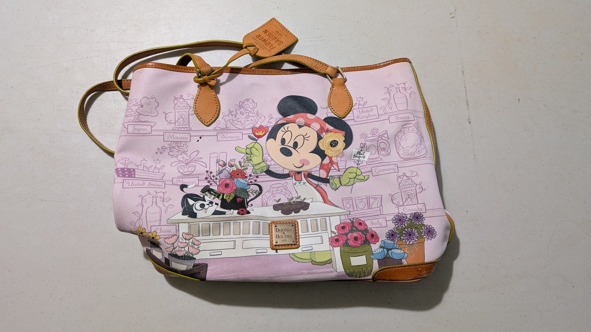 A pink tote bag with tan leather trim, featuring Minnie Mouse and Figaro gardening, with Epcot World Showcase pavilions named in the background.