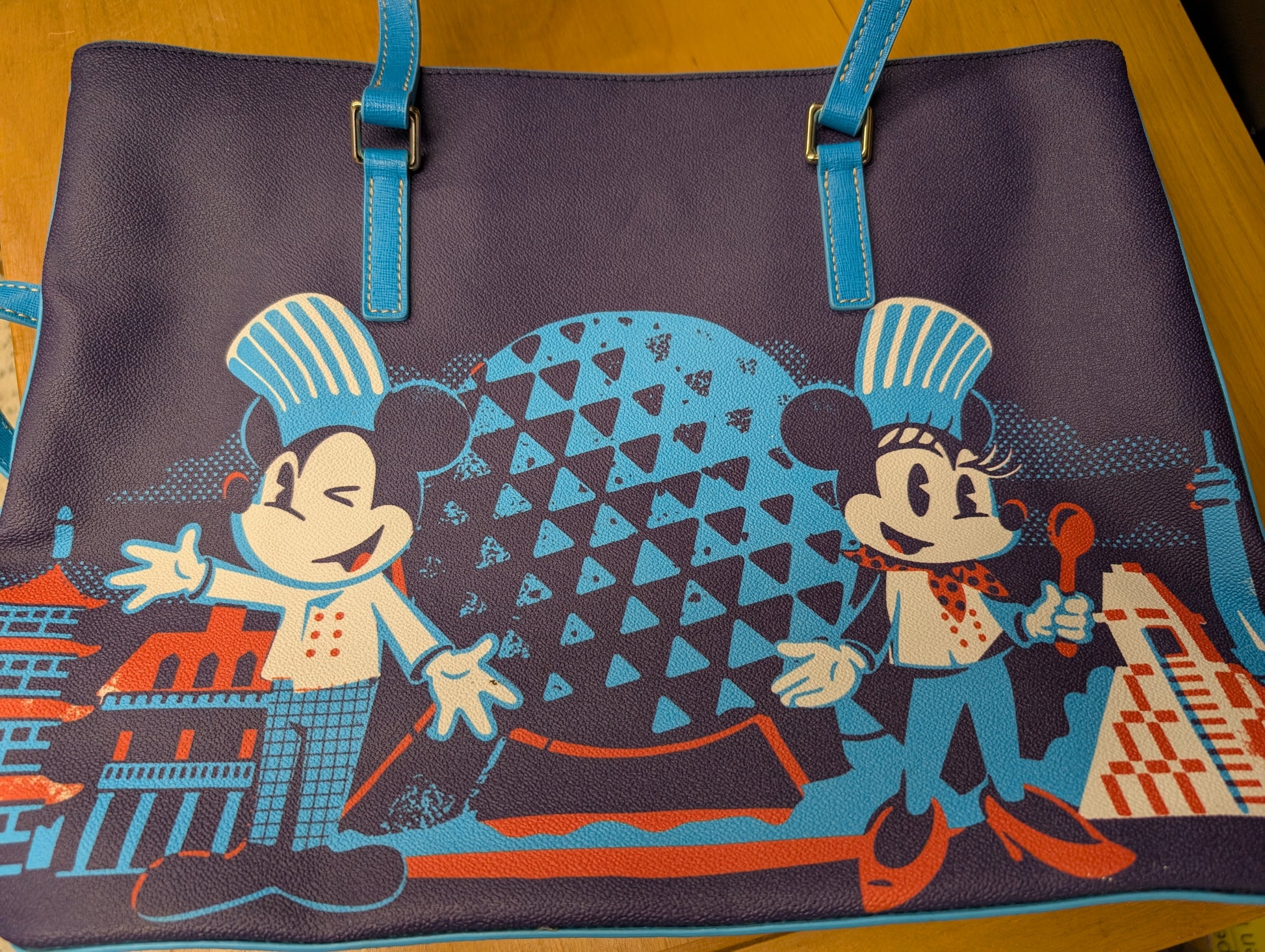 Epcot International Food & Wine Festival 2023 Tote Bag from Dooney & Bourke - 2023 Handbag (Coated Cotton, Leather Tote Bag, Disney Characters, Food, Epcot, Navy Blue, Bright Blue)