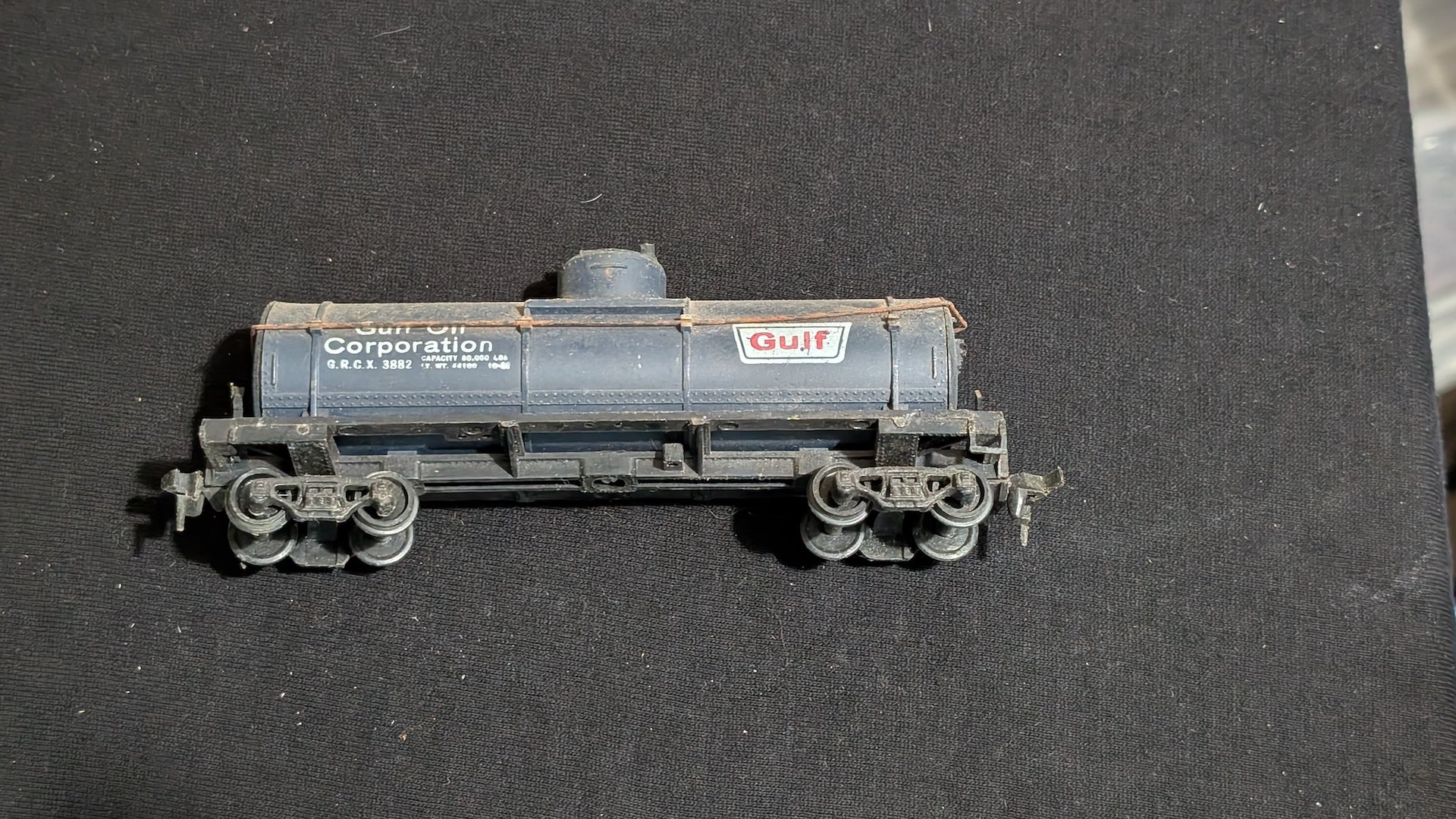 A blue Gulf Oil Corporation #3882 single-dome tank car. The decals are yellowed and peeling.