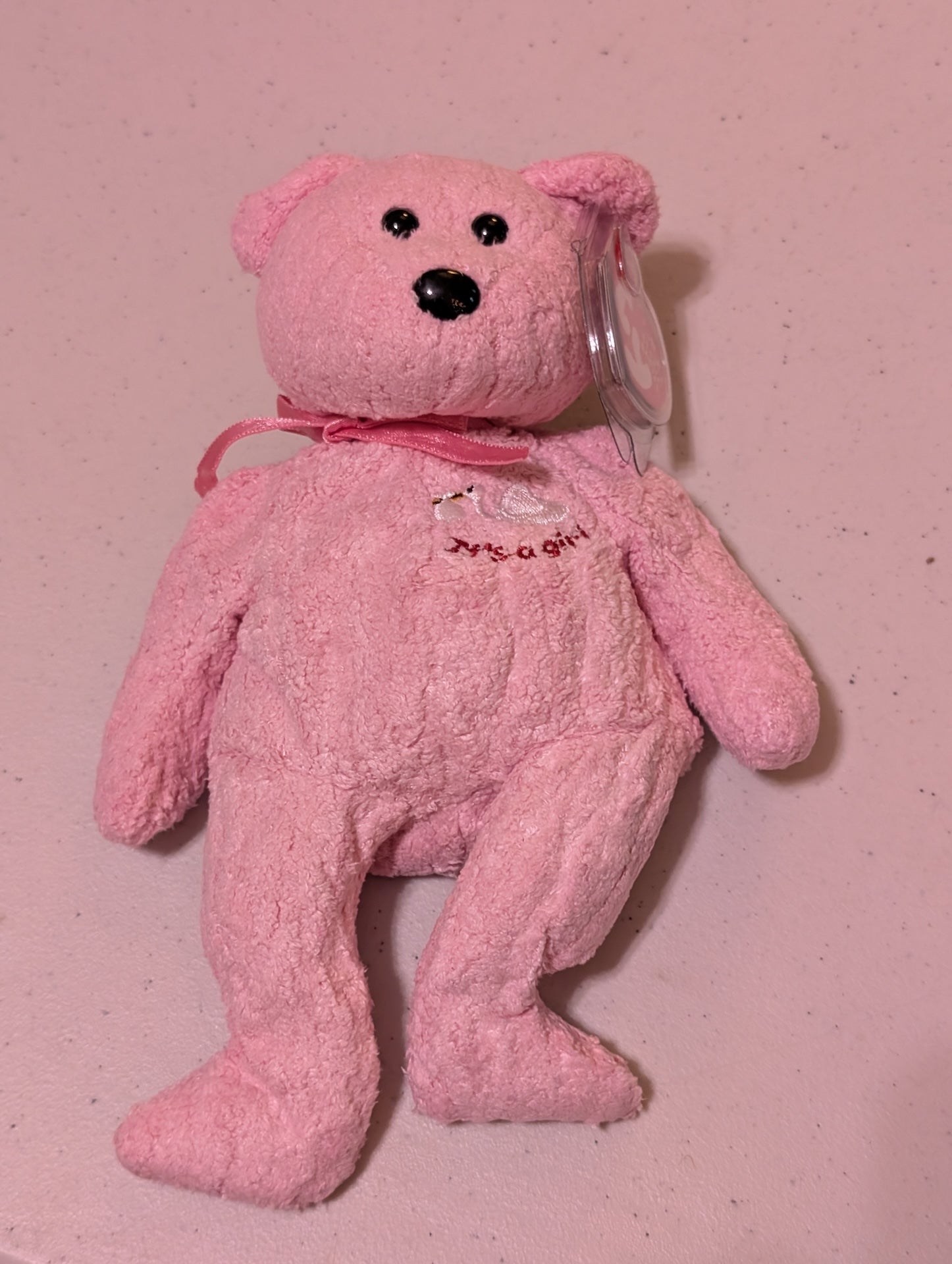 It's a Girl the Bear - Ty Beanie Baby (Pink, 2001, Plush Toy, MWMT, Stuffed Animal, Vintage, Retired, Plushie)