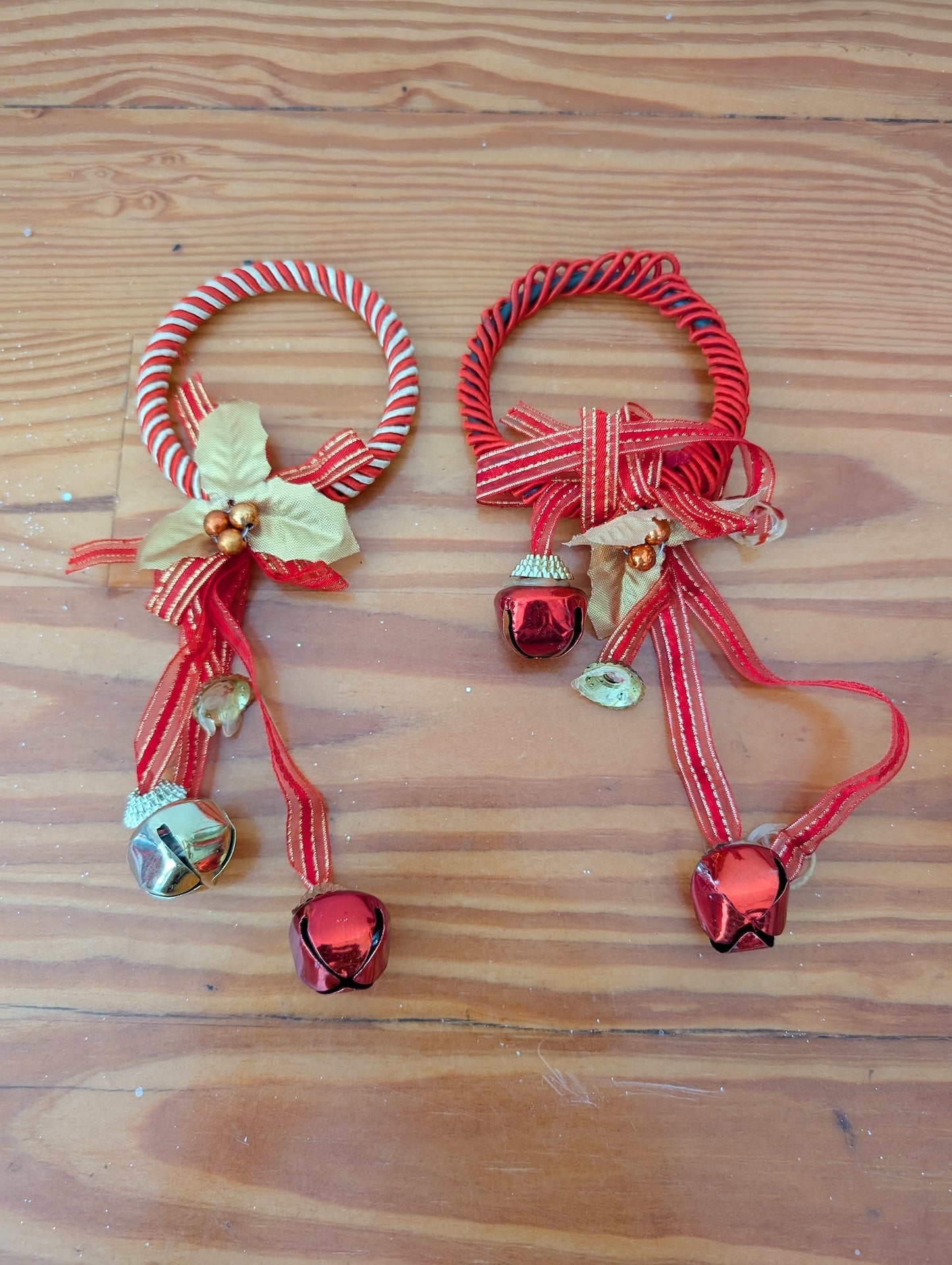 Two decorative hanging ornaments, each with a ring base (one striped, one red), adorned with ribbons and multiple jingle bells.