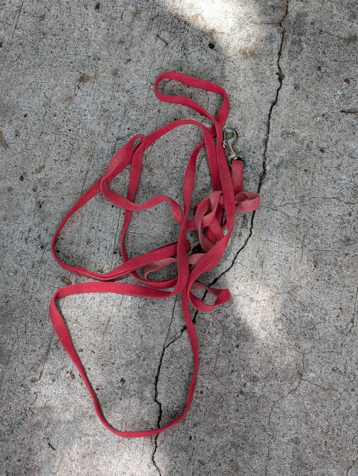 A long, flat red cotton or nylon strap with a brass-colored snap.