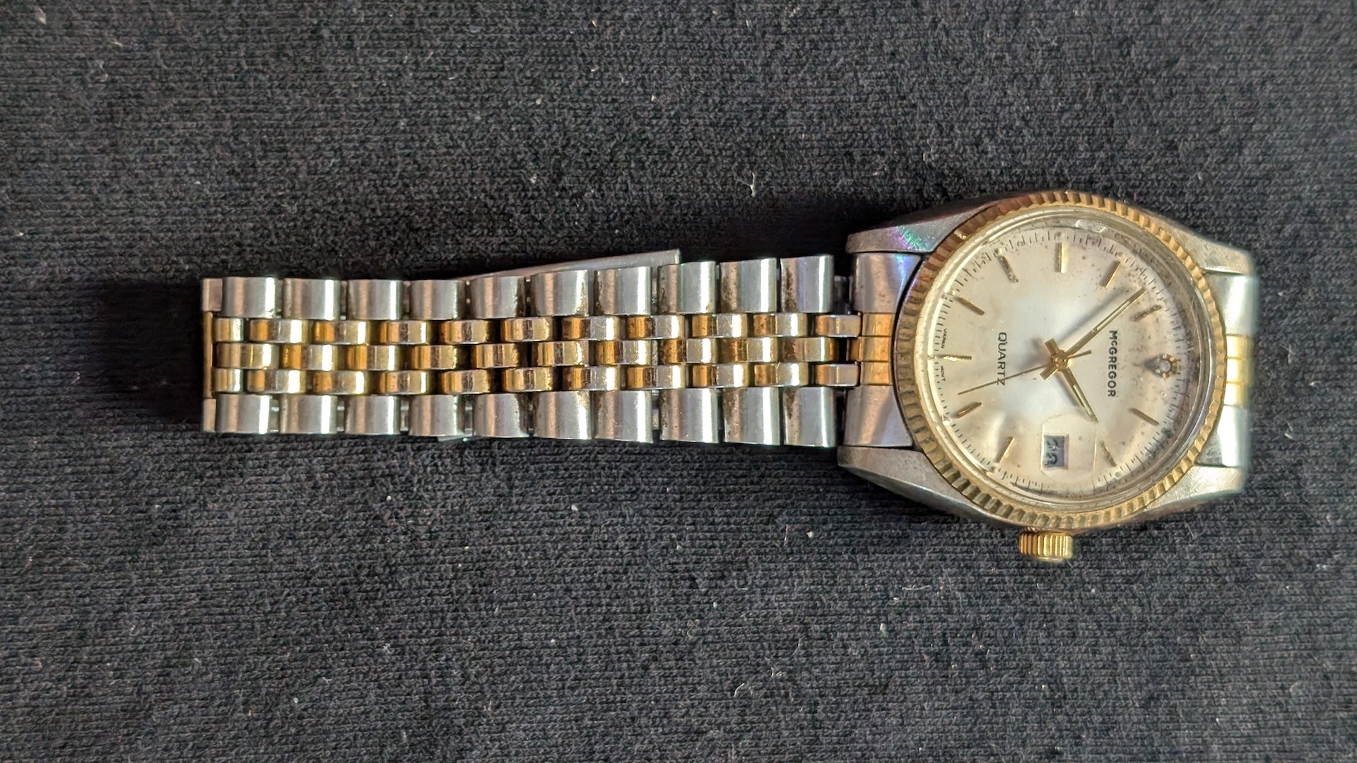 This is a classic men's dress watch from McGregor, designed in the iconic "Datejust" style. It features a two-tone (silver and gold) case and jubilee-style bracelet, a gold-tone fluted bezel, and a white dial with a date window. This watch has a timeless, sophisticated look. Untested, likely needs a new battery. Sold as-is.