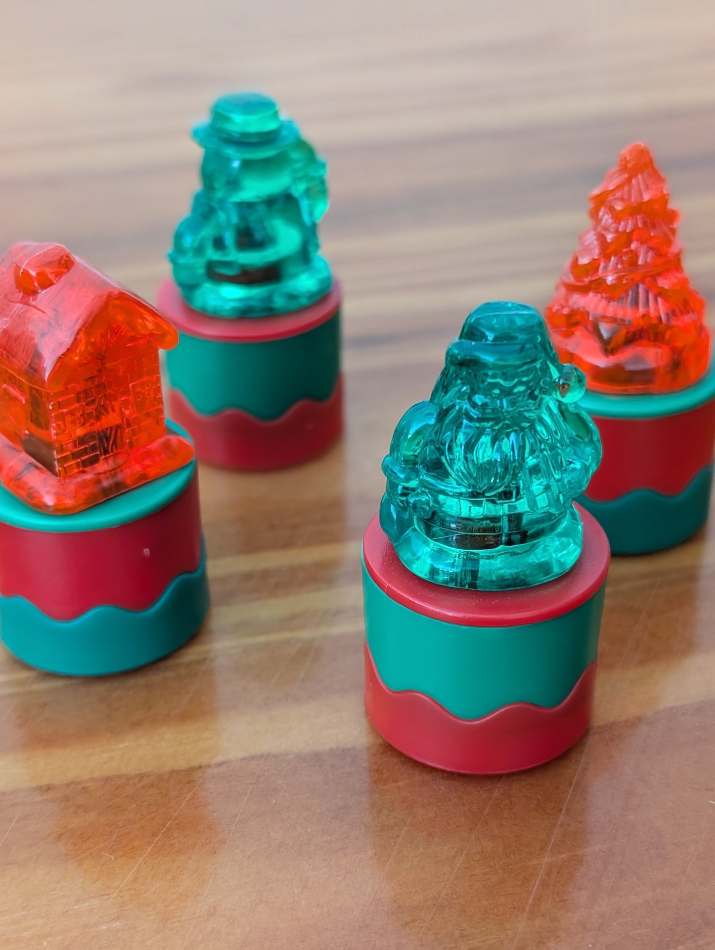 A set of four small, light-up tabletop decorations. The transparent plastic tops (Santa, house, tree) illuminate from the colored bases.