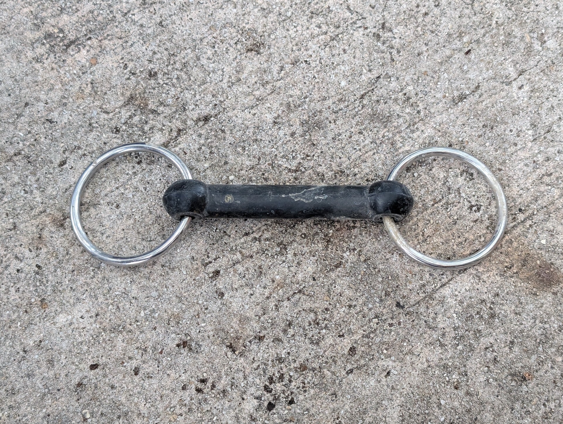 A used O-ring snaffle bit with a straight, black rubber-covered mouthpiece showing some wear.