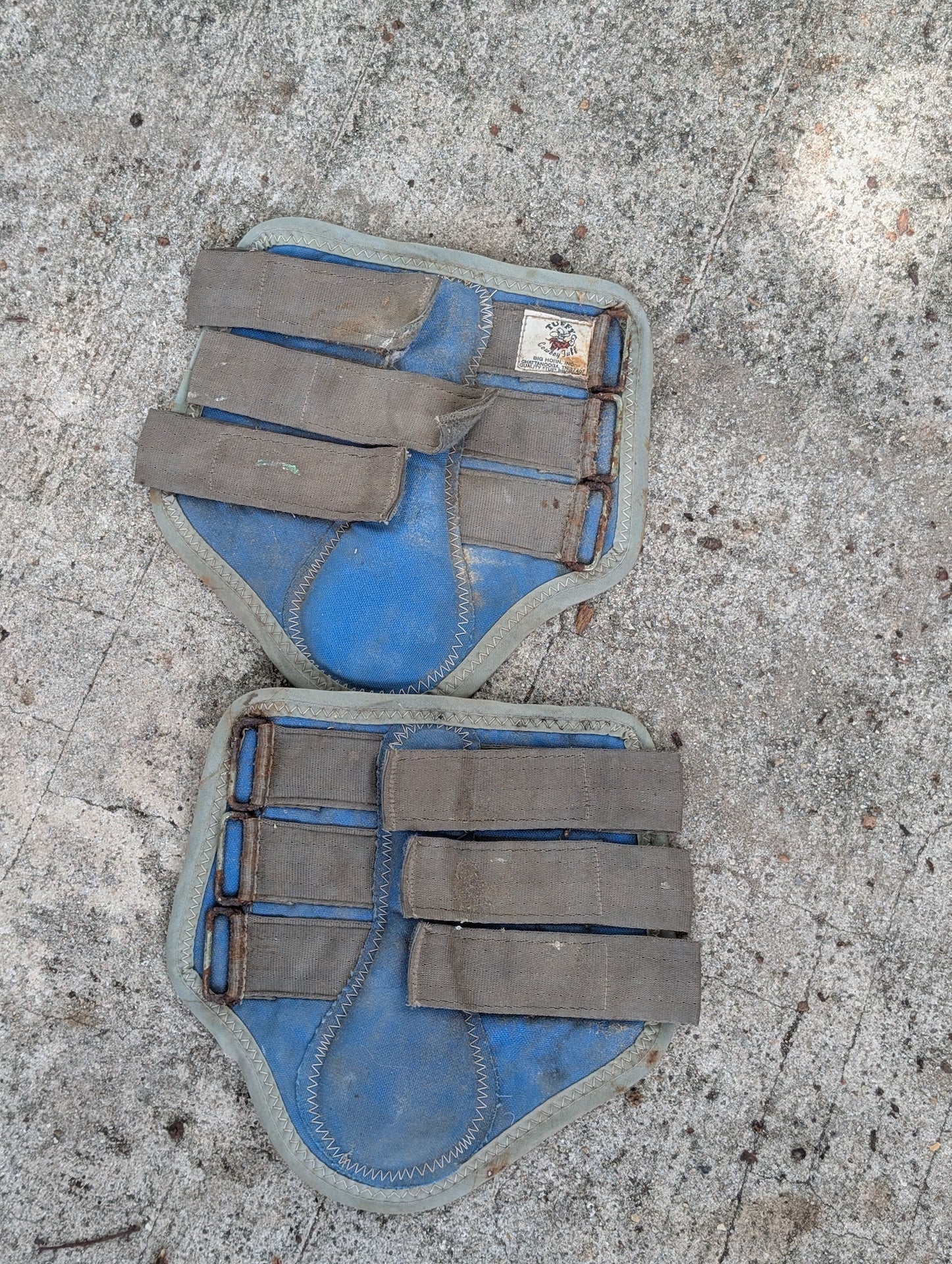 A pair of used blue splint boots with hook-and-loop closures, showing dirt and wear.