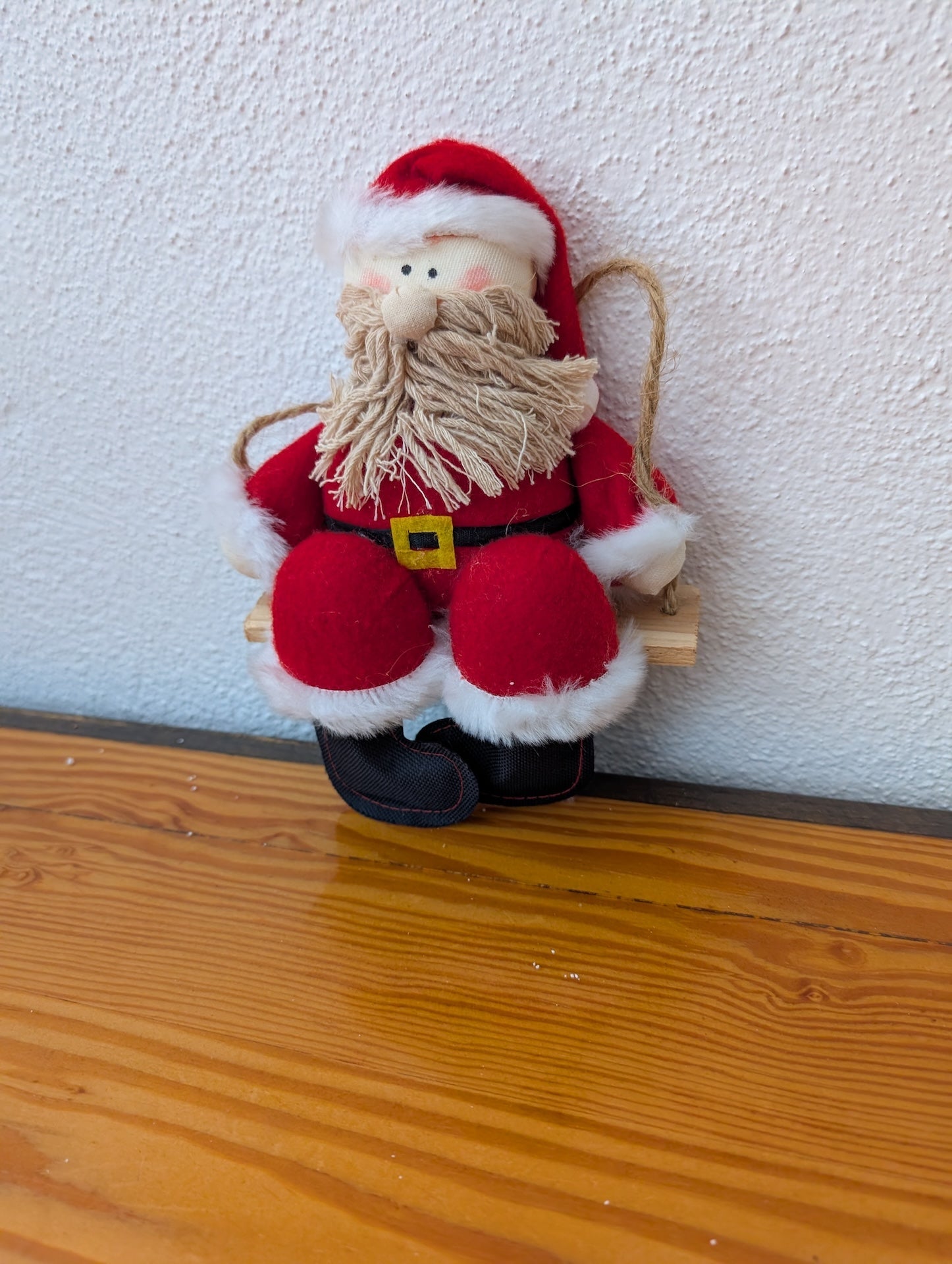 A plush Santa Claus ornament designed to look like he is sitting on a small wooden swing. He has a string beard and a red suit with faux fur trim.