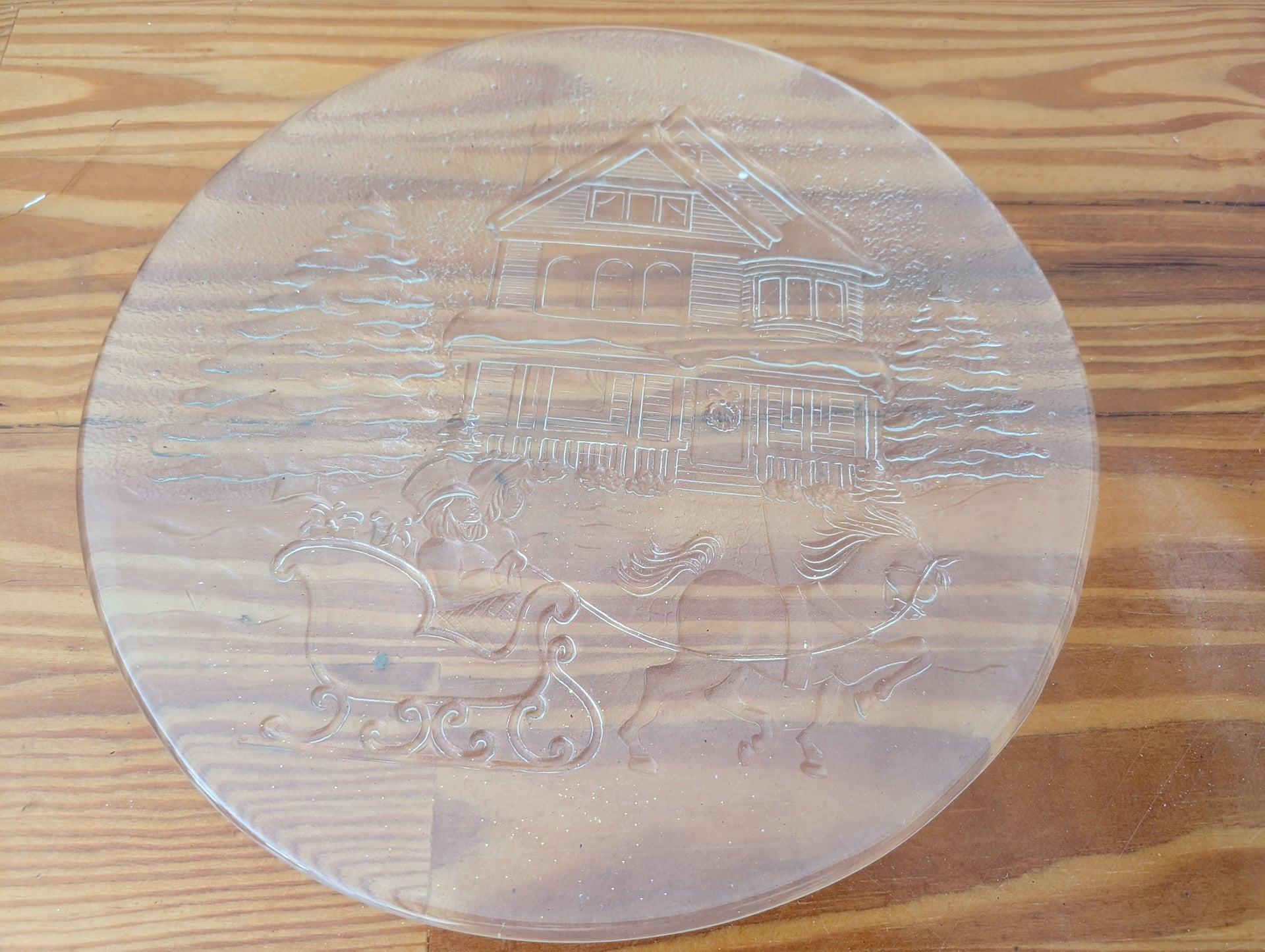 A large, clear, pressed glass platter with an embossed winter scene featuring Santa in his sleigh in front of a house. The platter has a glittery finish.